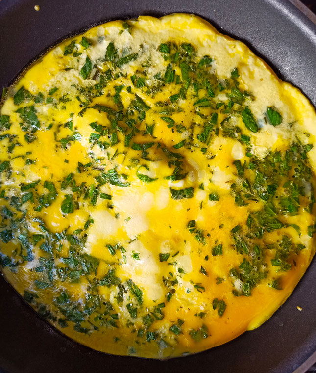 Erstes Wildkräuteromlett dieses Jahr mit Giersch, Knoblauchrauke und Schafgarbe